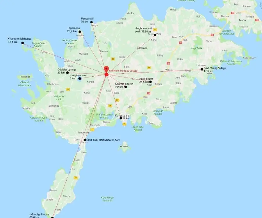 Отель Aadniel’s Holiday Village, расположенный по адресу Mäeniidi talu, 93711 Аула в Эстонии, предлагает бесплатную стоянку для гостей. Комплекс находится в уединённом месте, но при этом близко к ключевым достопримечательностям региона. В 22 минутах езды на машине (17 километров) расположена деревня Арендару (Арендовать), известная своими традиционными эстонскими домами и местной культурой. До аэропорта Квессааре можно добраться за 21 минуту на автомобиле (20 км), что делает отель удобным выбором как для отдыхающих, так и для путешественников с пересадками. Спортсмены оценят близость спортивного центра Курсаре, он доступен всего за 19 минут езды (18 км). Также рядом находится ферма Rose Farm Sheep Restore, специализирующаяся на восстановлении породы овец розовой шерсти; она расположена в 12 минутах езды (9 км). Ещё одна интересная точка, ежедневные мероприятия или выставки под названием Ежедневно находятся в той же зоне досягаемости (18 км, 19 минут на авто).